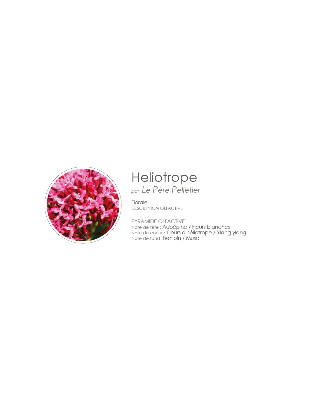 Pyramide Olfactive : Aubépine, Fleurs Blanches | Fleurs d'héliotrope, Ylang Ylang | Benjoin, Musc.